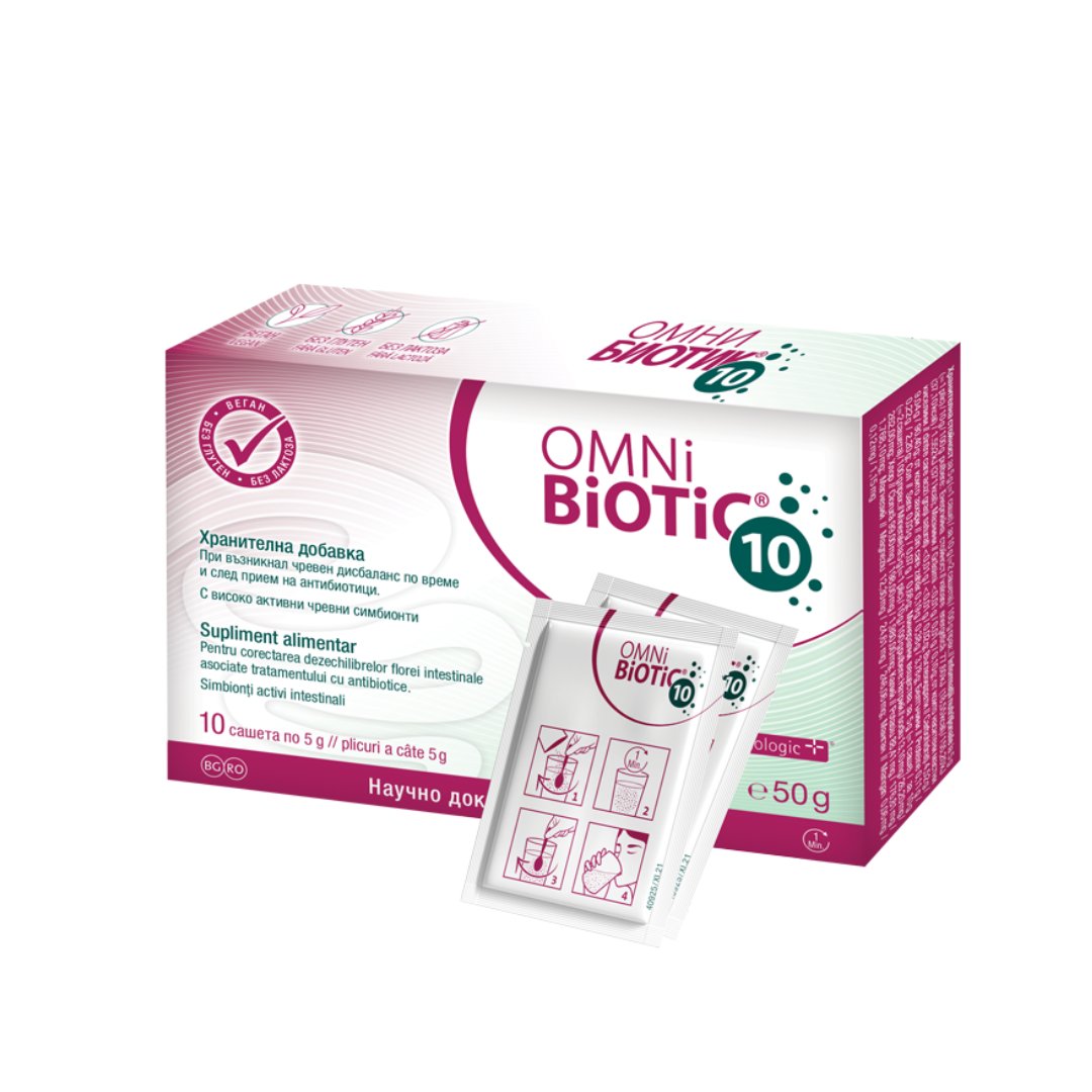 Dozare: Cel mai bine este să îl administrați înainte de masă, eventual cu o anumită perioadă de timp între administrarea antibioticului. (3 ore)În timpul terapiei cu antibiotice: 1 plic de OMNI‑BIOTIC® 10 de două ori pe zi.