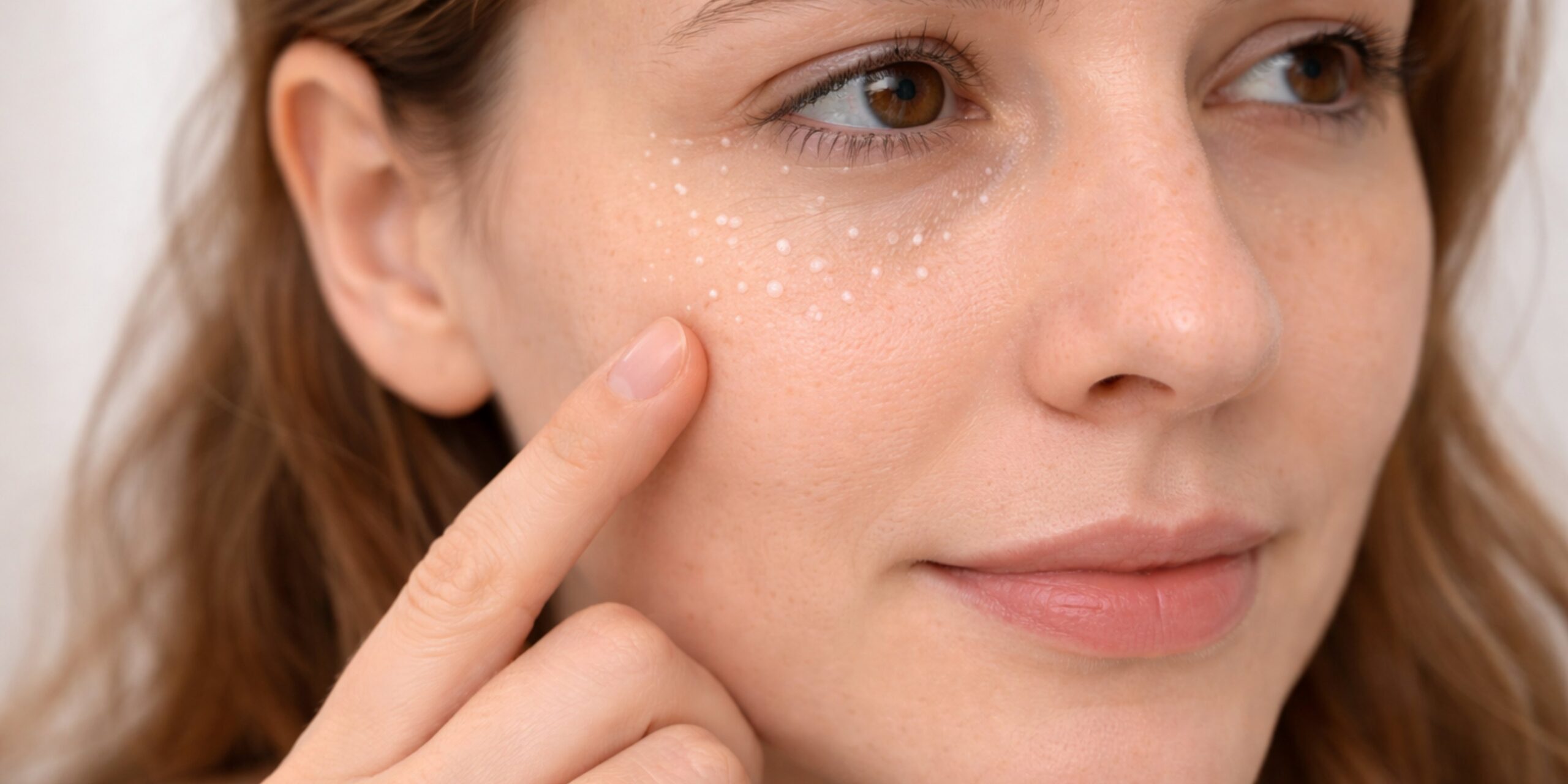 Apariția unor mici papule albe sau galbene pe față, în special pe obraji, nas sau frunte. Pielea din jur este normală, fără inflamație semnificativă.